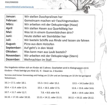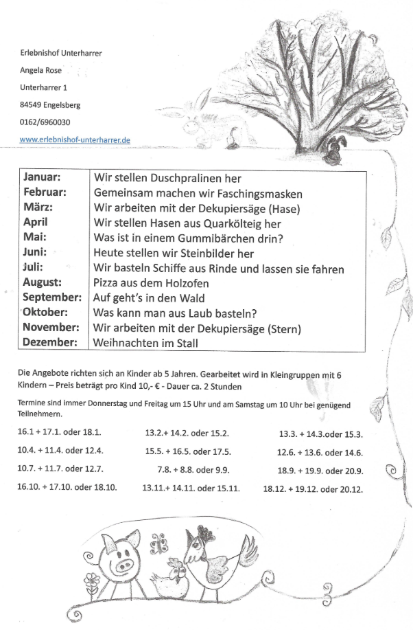Unser Erlebnisbauernhof liegt idyllisch zwischen Wiesen und Wäldern in Engelsberg. Er besteht aus einer traumapädagogischen Praxis für Kinder und Jugendliche, einem Erlebnishof mit vielen Tieren und pädagogischen Angeboten und dem Programm Fit für den Bauernhof, was Schulen, Kindergärten oder Kommuniongruppen anspricht.